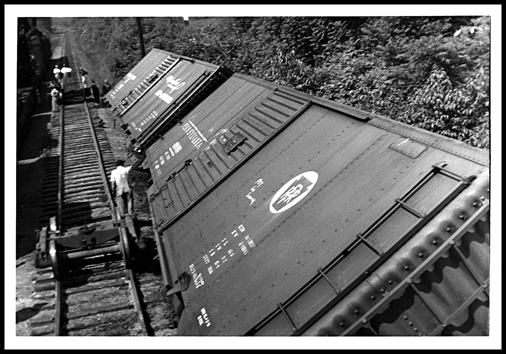 URR photo of a derailment at Mifflin Jct. Two loaded box cars on the PWV line looking west towards Longview.